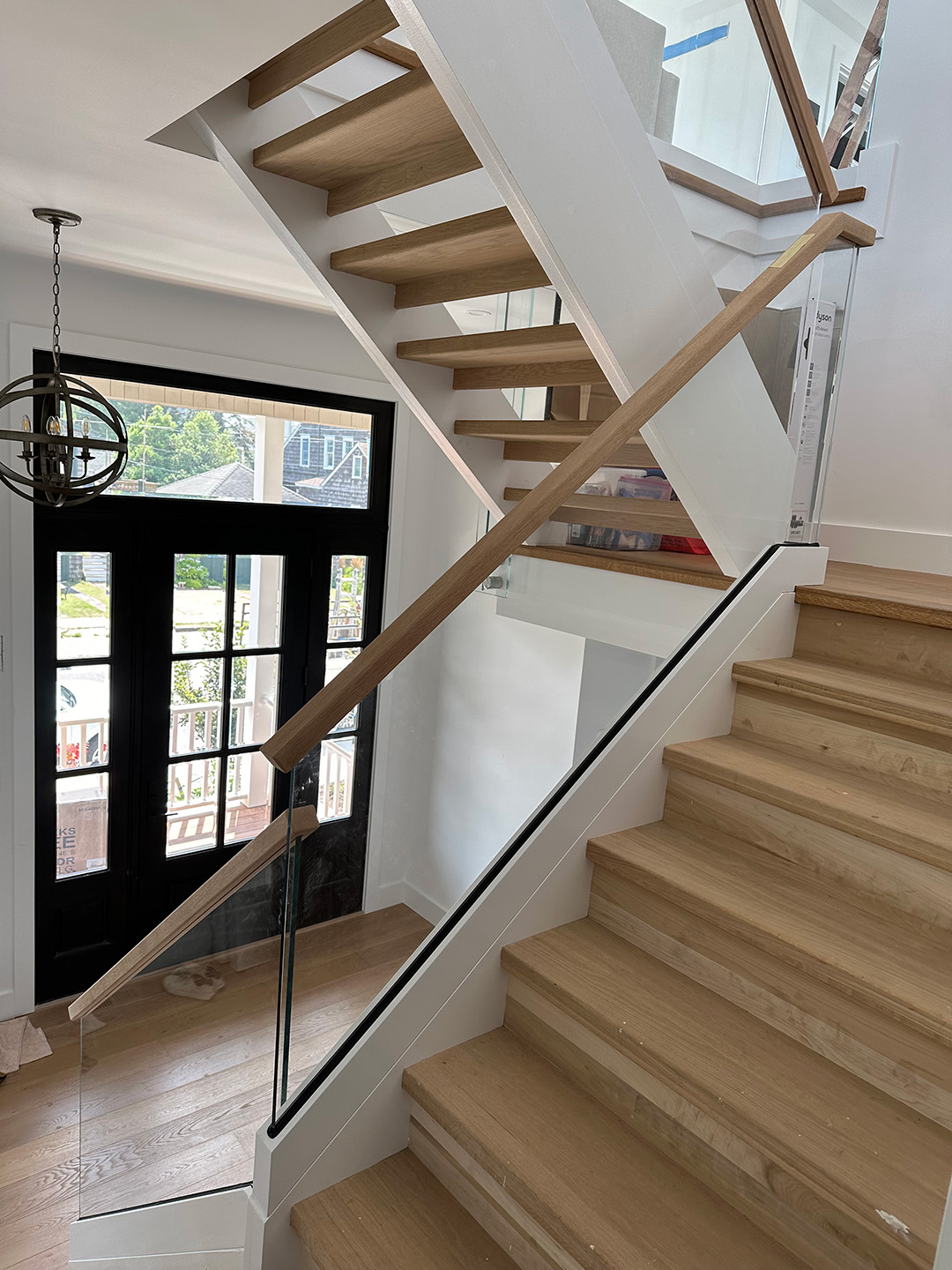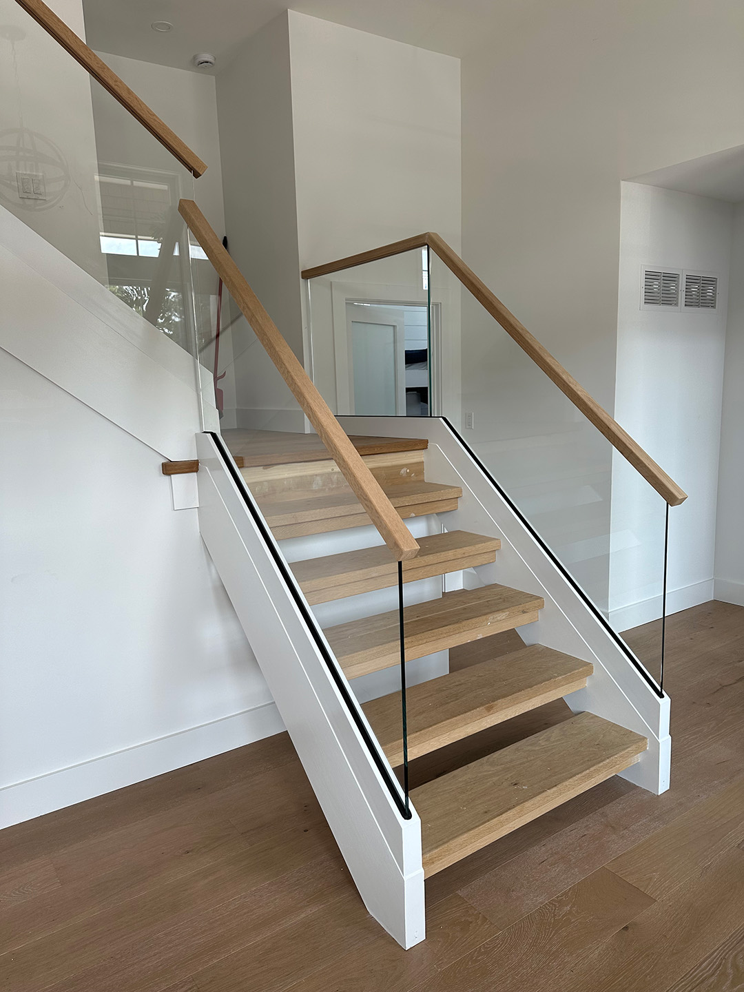 Description: free standing glass ½’’ glass rail , no post design, channeled base mount with channeled white oak handrails.