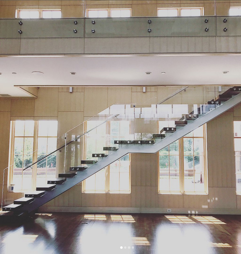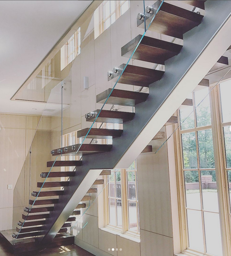 Description: pre drilled ½’’ glass rail, free standing tread mount to open floating stairs, no cap rail with pre drilled graspable satin stainless steel handrails and stainless steel satin mounting covers. No post supports needed.