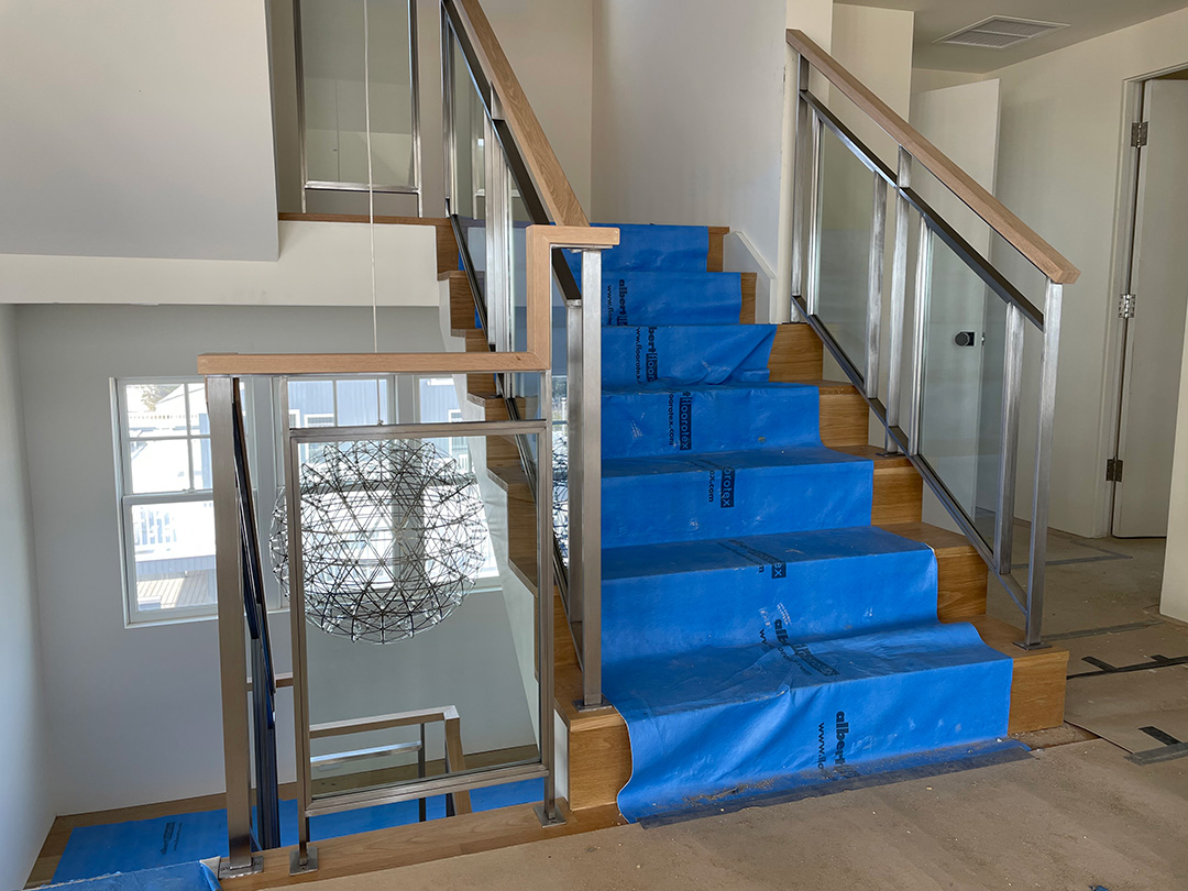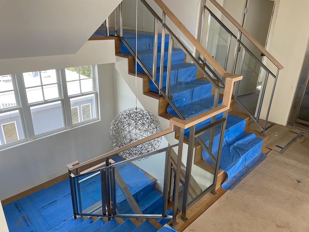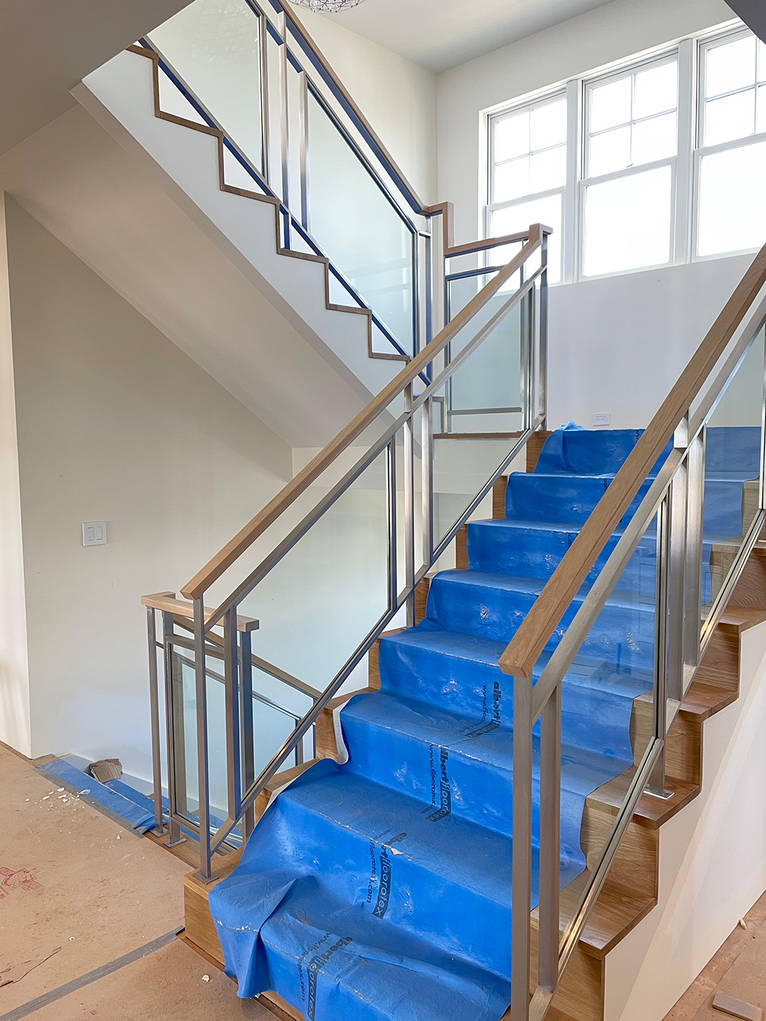 Description: Stainless steel panel ½’’glass rail with open sub channel, white oak cap rails , exposed mounting plates, industrial/modern look.